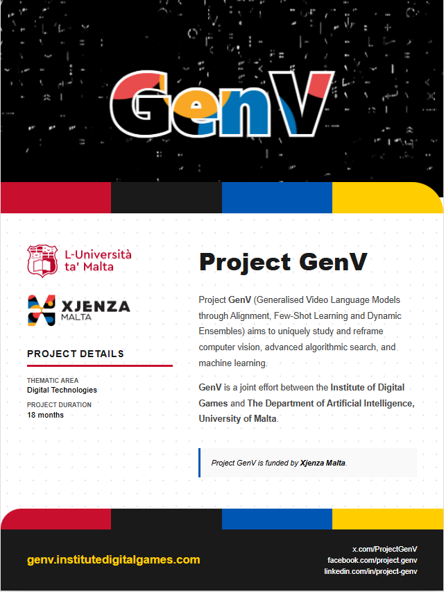 Project GenV is spearheaded by Institute of Digital Games, Malta and The Department of Artificial Intelligence, University of Malta and funded by Xjenza Malta.